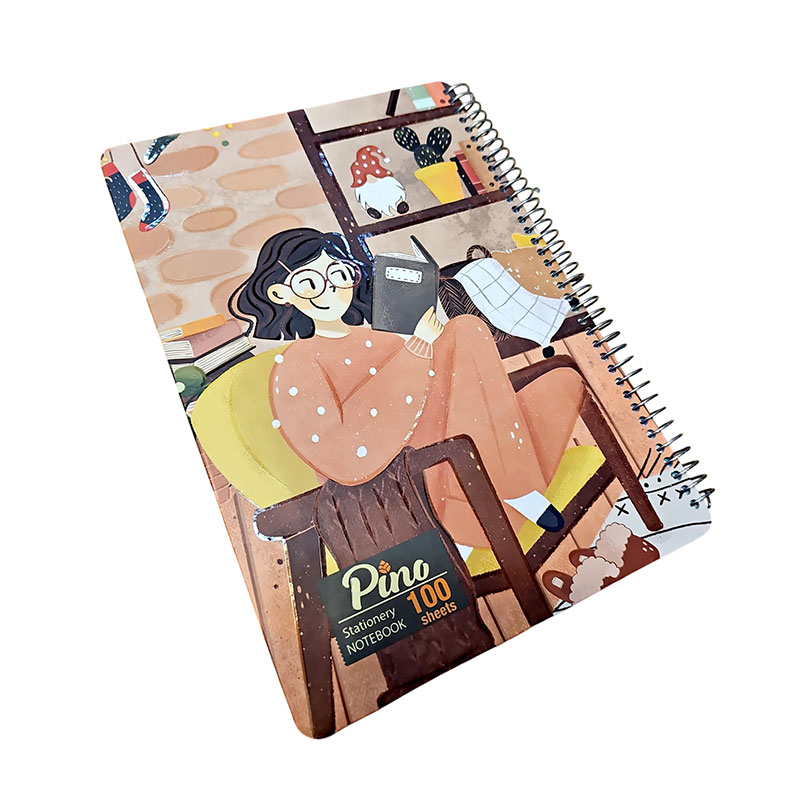 دفتر 100 برگ خط دار تک سیم جلد سخت دفتری است با جلد سخت و با فنر تک سیم نقره ای اعلاء صحافی شده است و جلد سخت آن بسیار مقاوم است و جلد آن دارای طرح های متنوع است.